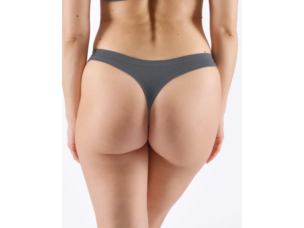 Boková tanga s úzkým bokem, dámské bezešvé prádlo. Pasový kraj je zesílený a zapravený bezešvým způsobem. Nohavičky jsou začištěné podehnutím. Kalhotky jsou jednobarevné. V záložce je vypletené logo.