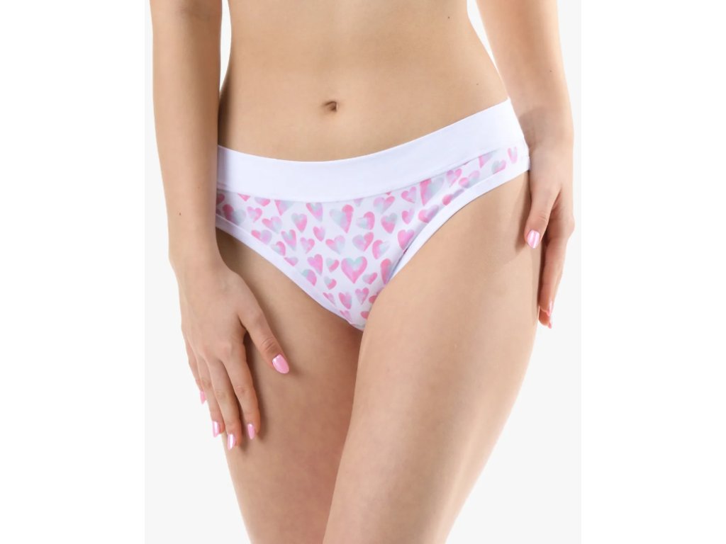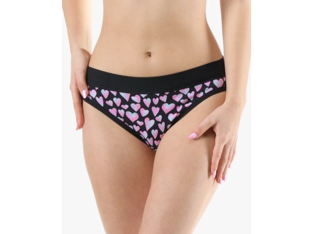 Kalhotky klasického střihu s úzkým bokem a širším pasovým lemem, dámské šité prádlo. Pasový kraj je začištěný širším lemem ze stejného materiálu. Nohavičky jsou začištěné úzkým lemem ze stejného materiálu. Přední díl je potištěný. Zadní díl a lemy jsou jednobarevné.