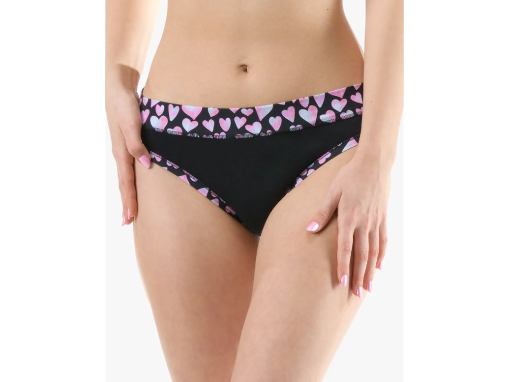 Kalhotky klasického střihu s úzkým bokem a širším pasovým lemem, dámské šité prádlo. Pasový kraj je začištěný širším lemem ze stejného materiálu. Nohavičky jsou začištěné úzkým lemem ze stejného materiálu. Přední díl je jednobarevný, lemy v pase a v nohavičkách jsou potištěné.