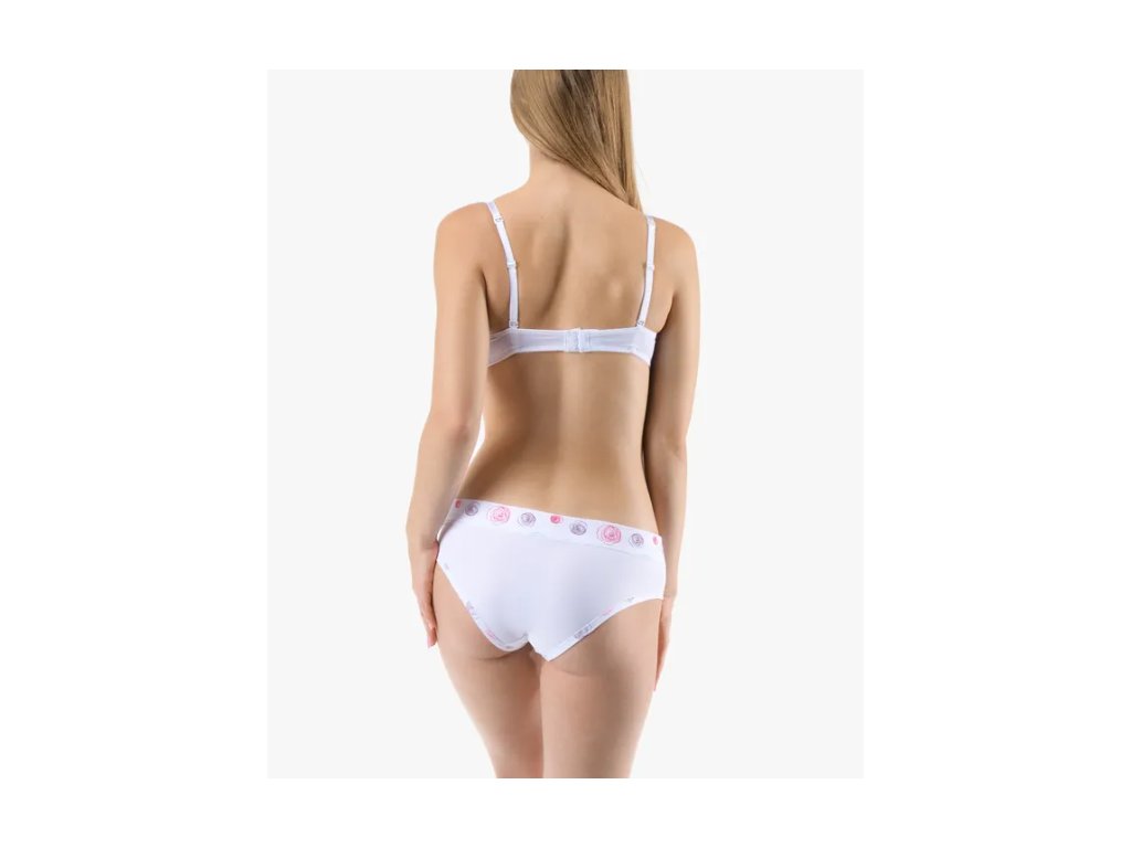 Bokové kalhotky francouzského střihu se širokým bokem a širším pasovým lemem, dámské šité prádlo. Pasový kraj je začištěný širším lemem ze stejného materiálu. Nohavičky jsou začištěné úzkým lemem ze stejného materiálu. Lemy v pase a v nohavičkách jsou potištěné, přední a zadní díl je jednobarevný.