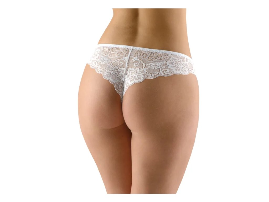 Boková tanga s úzkým bokem, dámské šité prádlo. V pasovém kraji je našitá pruženka s ozdobným krajem. Kalhotky jsou celokrajkové, uvnitř je všitý bavlněný klínek. Kalhotky jsou jednobarevné.