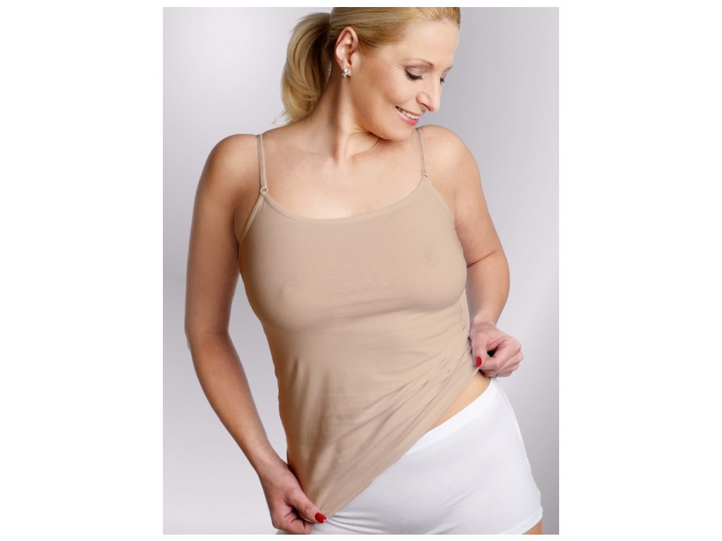 Tílko/košilka z příjemného bavlněného materiálu s lycrou. Díky nenápadným posunovačům ramínek na zádech si pohodlně upravíte potřebnou délku, ramínka jsou úzká. Top je hladký, takže ho v létě můžete nosit jako tílko a na podzim vás příjemně zahřeje. Délka je mírně prodloužená!