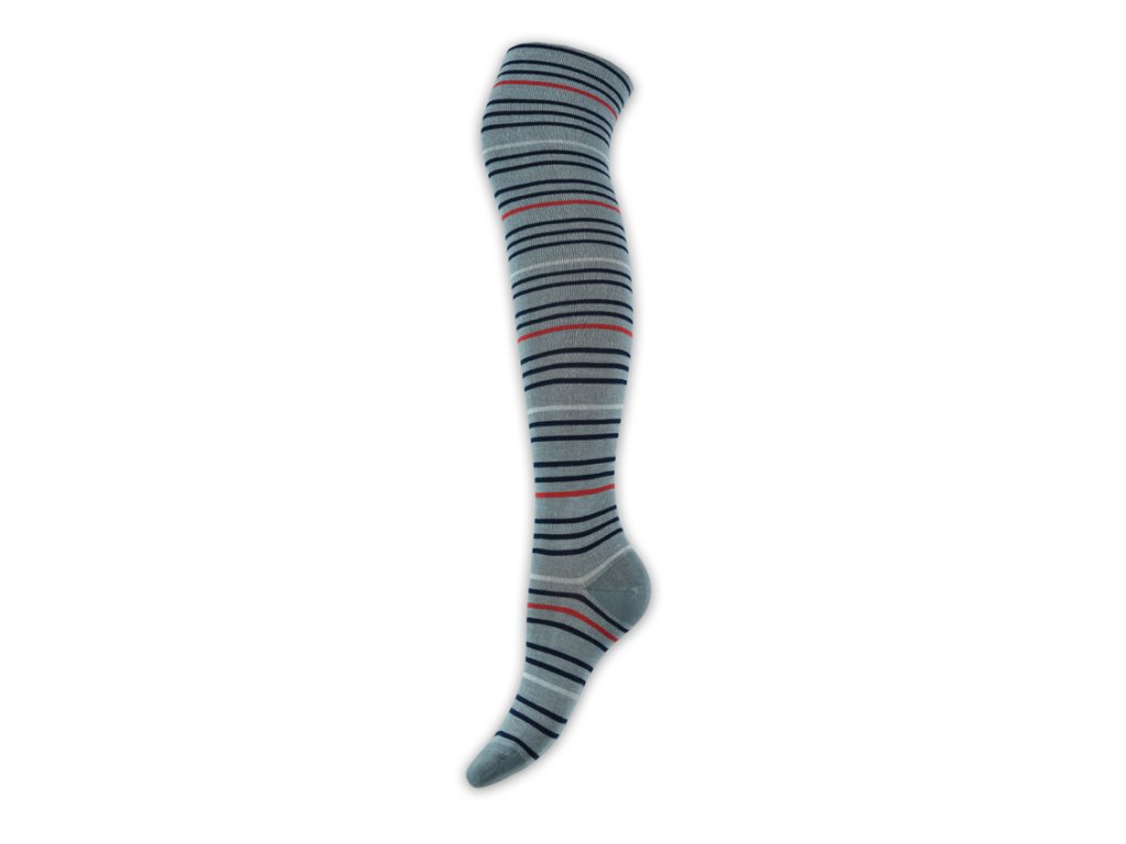 Dětské punčocháče s velkým podílem bavlněného vlákna. Motiv střídajících se pruhů na šedém podkladě.
