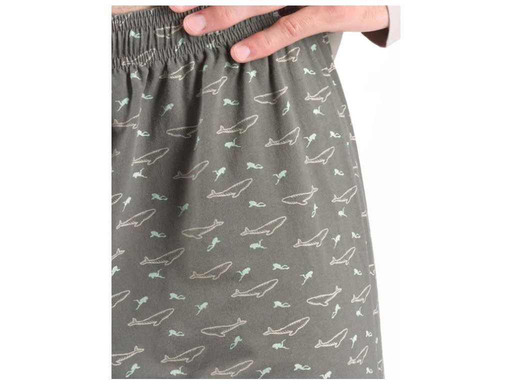 Pánské klasické pyžamo volného střihu z jemného úpletu Vám poskytne pohodlí během spánku. Potisk velryby je na kalhotách i na hrudi trika s dlouhými rukávy.