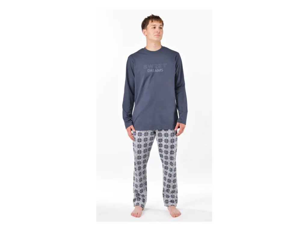 Pánské klasické pyžamo volného střihu z jemného úpletu Vám poskytne pohodlí během spánku. Kalhoty s výraznějším vzorem doplňuje triko s dlouhými rukávy a potiskem na hrudi.