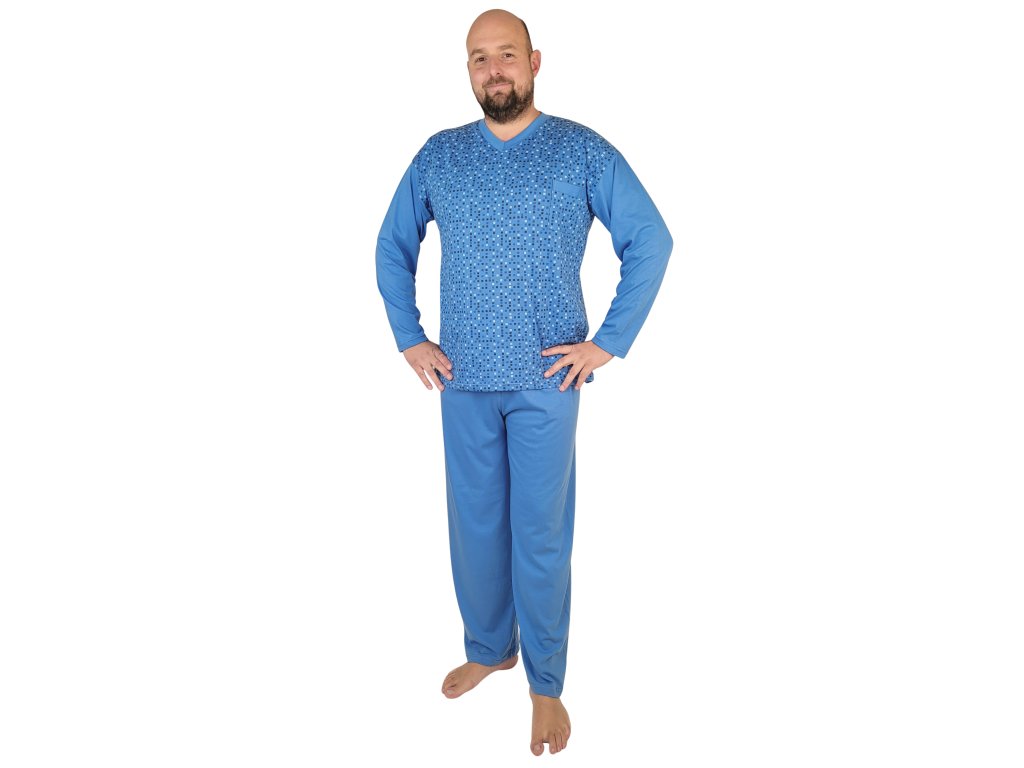 Pánské dlouhé bavlněné pyžamo. Velmi zajímavý elegantní vzor. Střih pyžama je volného strihu s výstřihem do V. Zakončení rukávů a kalhot je bez nápletu (manžety). Lem u krku je v barvě kalhot. Na prsou kapsička.