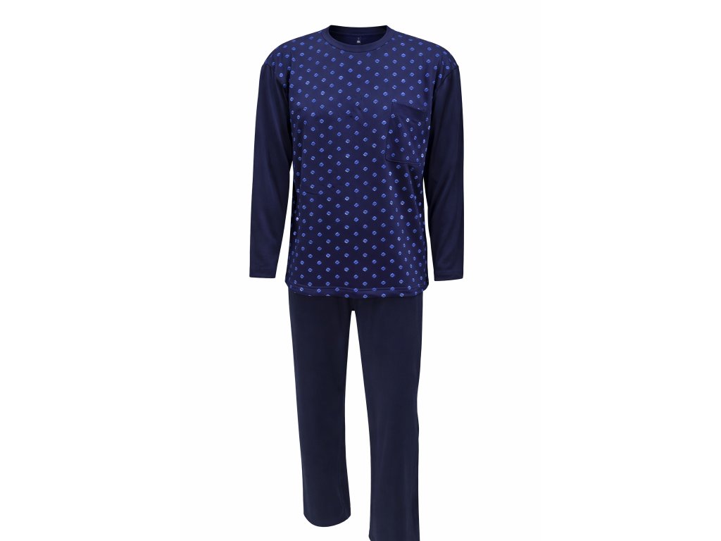 Pánské dlouhé bavlněné pyžamo. Vyrobeno z kvalitní certifikované 100% bavlny. Střih pyžama je volného strihu s výstřihem do U. Zakončení rukávů a kalhot je bez nápletu (manžety). Lem u krku je v barvě kalhot. Na prsou praktická kapsička.Doplňkové parametry