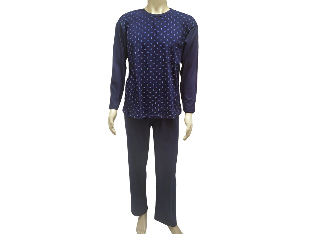 Pánské dlouhé bavlněné pyžamo. Vyrobeno z kvalitní certifikované 100% bavlny. Střih pyžama je volného strihu s výstřihem do U. Zakončení rukávů a kalhot je bez nápletu (manžety). Lem u krku je v barvě kalhot. Na prsou praktická kapsička.