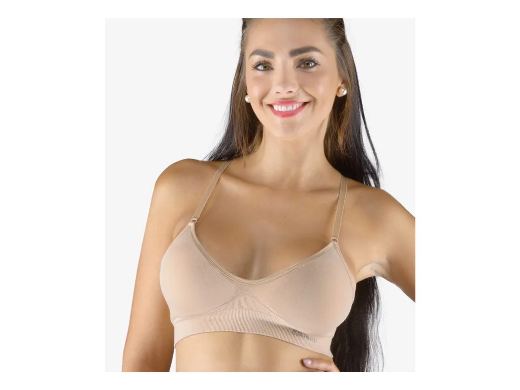 Podprsenka bez kostic s vyjímatelnými vycpávkami a nastavitelnými ramínky, dámské bezešvé sportovní prádlo. Dolní kraj je zesílený a zapravený bezešvým způsobem. Horní kraj je zapravený lemovkou. Přední díl je dvojitý a mezi vnější a vnitřní část jsou vloženy lisované košíčky. Zadní díl je v celku. Ramínka jsou nastavitelná, na zadním díle jsou pomocí kroužku umístěna uprostřed. Podprsenka je jednobarevná. V záložce je vypletené logo.