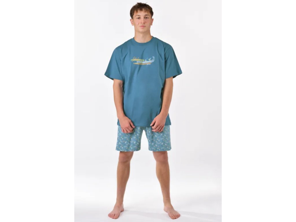 Pánské pyžamo volného střihu z jemného úpletu Vám poskytne pohodlí během spánku. Krátké kalhoty jsou potištěny drobným vzorem, triko s krátkými rukávy zdobí větší potisk na hrudi.