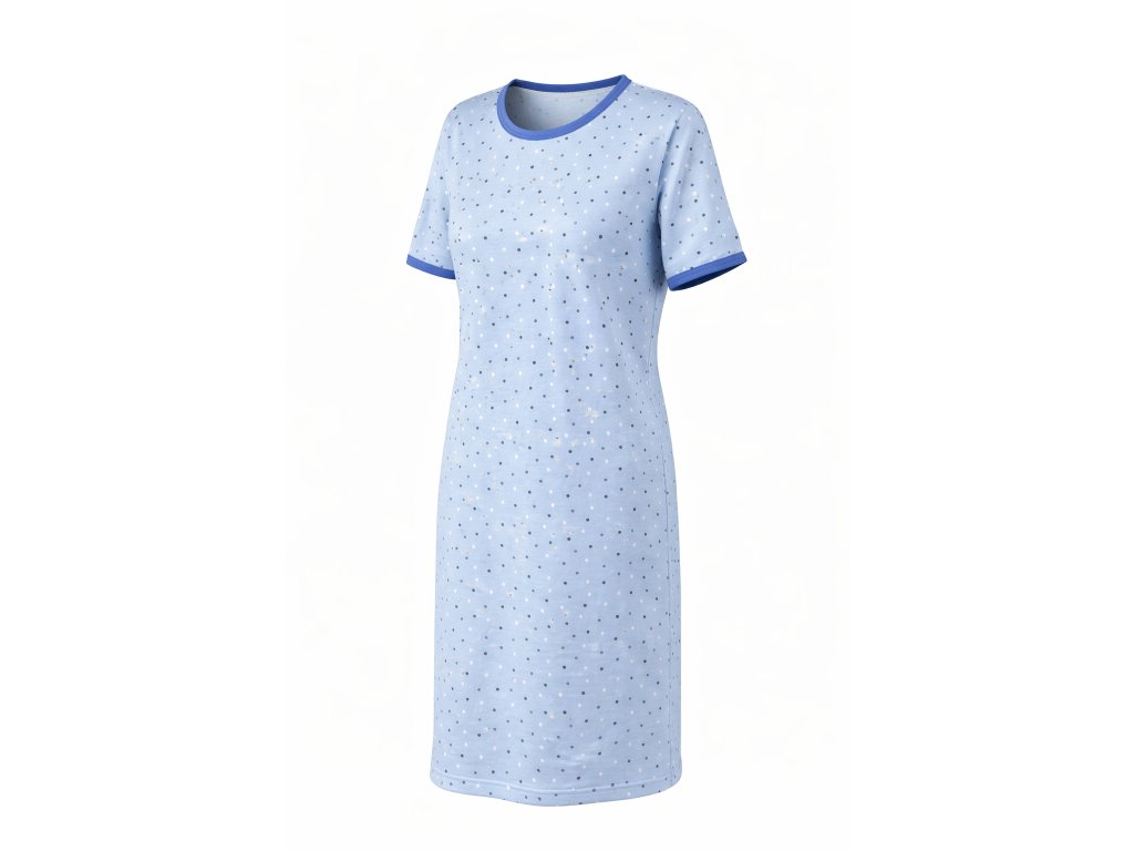Krátká dámská noční košile s celoplošným vzorem, zdobená jednobarevnou lemovkou. Vyrobena z velmi příjemné certifikované bavlny. Krátké rukávy.