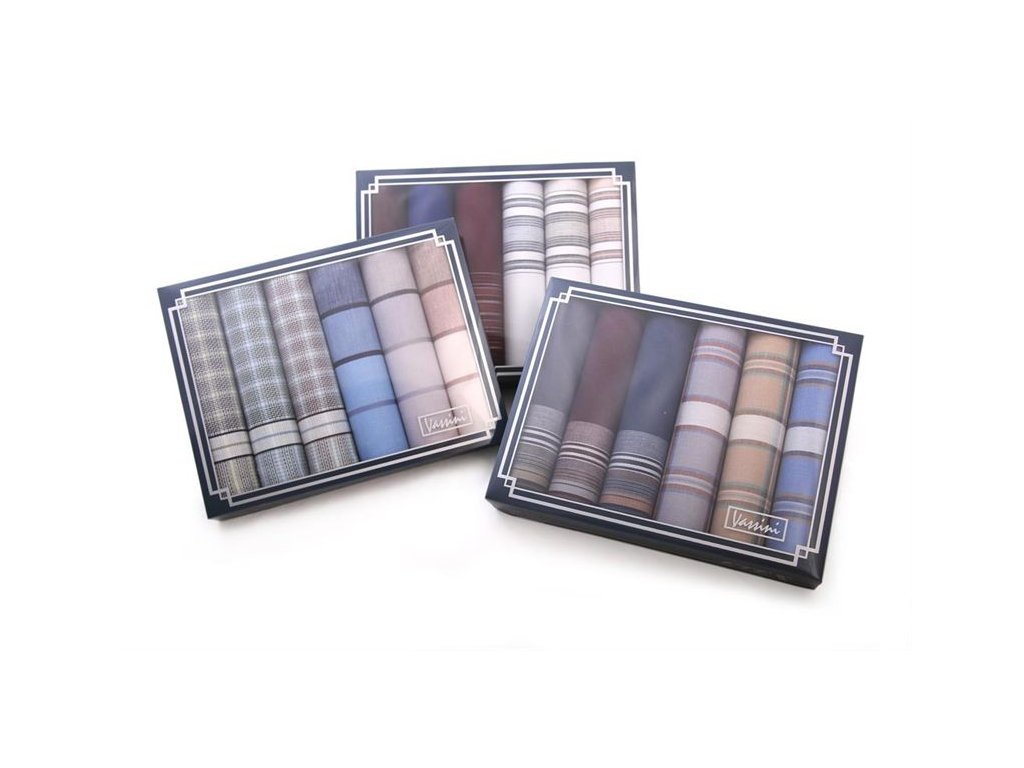 Kvalitní pánské kapesníky ze 100% česané bavlny. Dárkové balení - 6 kusů, mix 2 vzorů a různých barev.