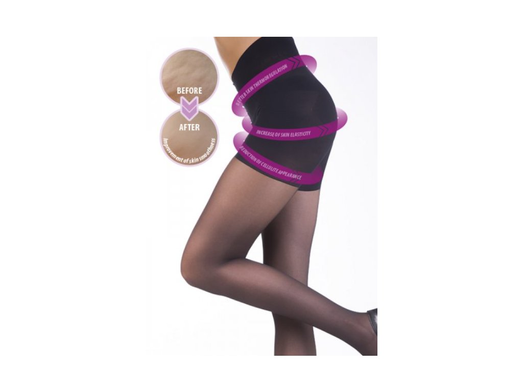 Anticelulitidní punčochové kalhoty, které zlepšují krevní oběh i zlepšují elasticitu pokožky a vyhlazují pomerančovou kůži. Díky nové technologii EMANA zrychlují krevní cirkulaci, vyvažují tělesnou teplotu a tak přispívají k eliminaci nevzhledné celulitidy. Jemnost vlákna 20 DEN.