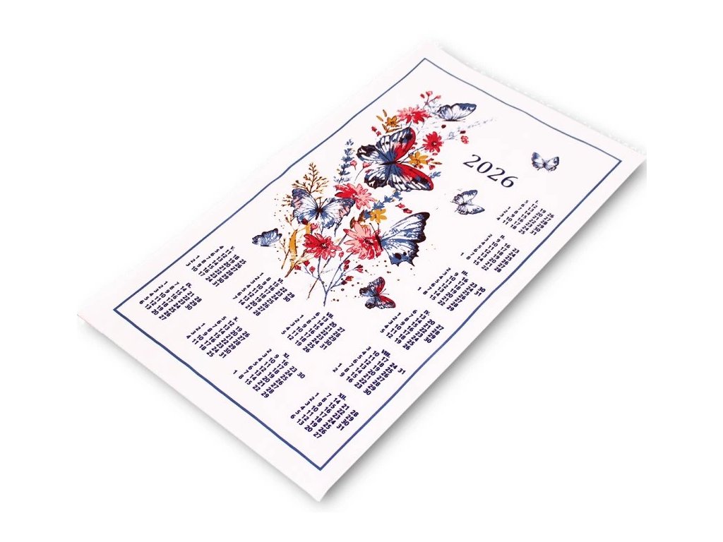 Textilní kalendář MOTÝL 2026, je praktickým doplňkem do Vaší kuchyně. Kalendář lze využít pro dekorativní účely s kalendáriem nebo jako plnohodnotnou utěrku s vynikajícími funkčními vlastnostmi. rozměr: 42x70 materiál: 100 % bavlna gramáž: 190g/m2 Doporučená teplota praní: 60°C